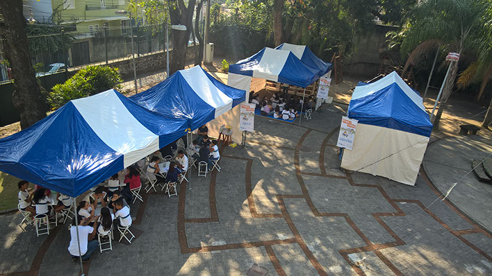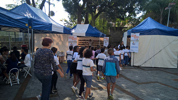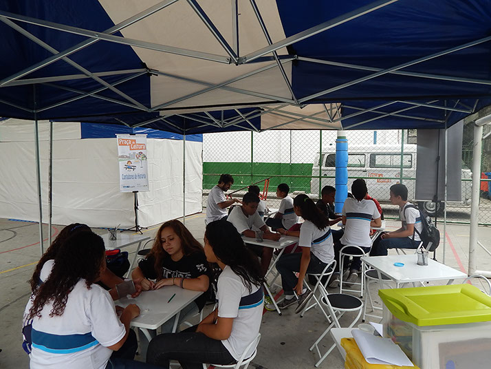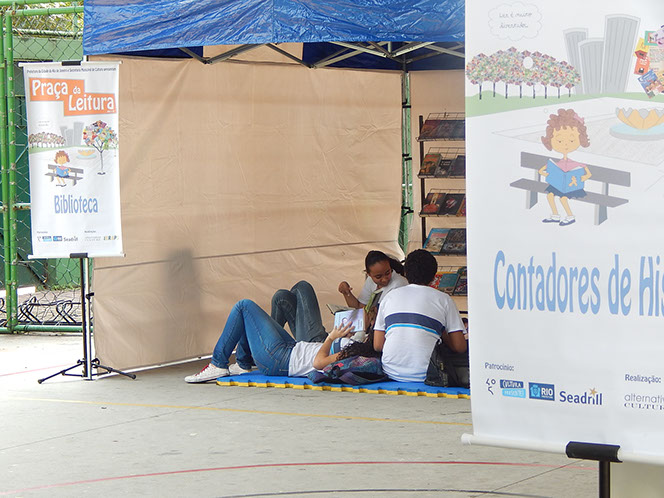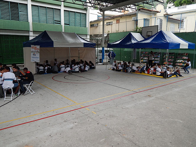 A Praça da Leitura consiste na montagem de uma biblioteca e três oficinas em escolas ou espaços